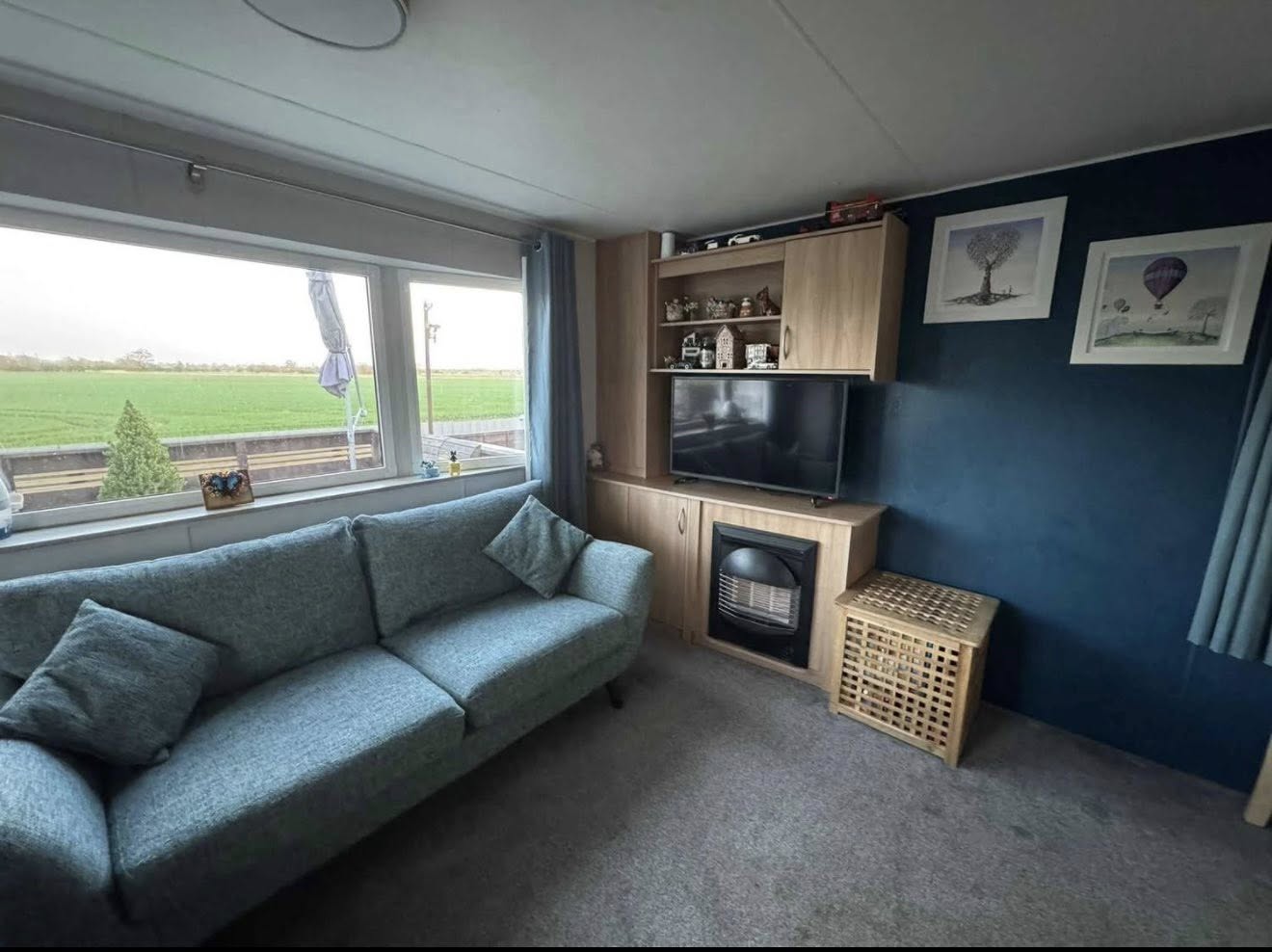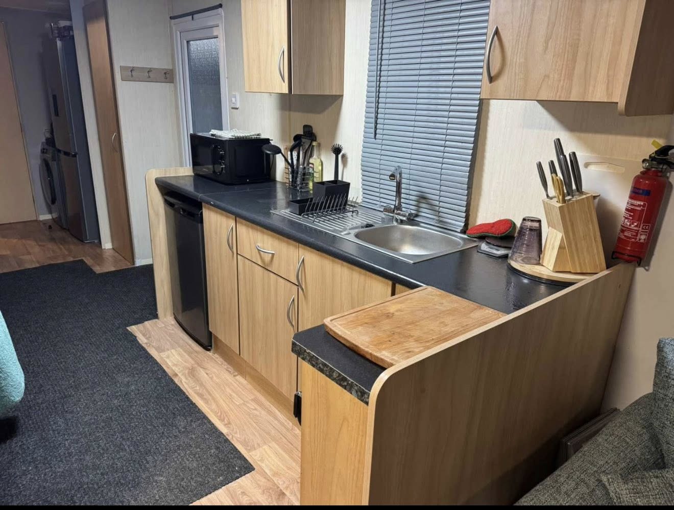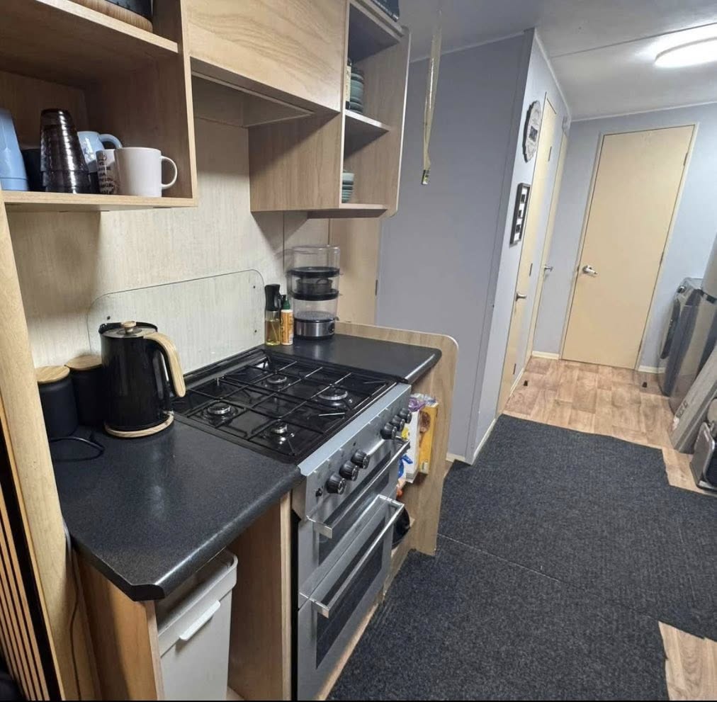 The caravan has been thoughtfully upgraded with double glazing and panel heaters throughout, ensuring warmth and efficiency all year round. The fully equipped kitchen includes a washing machine and a full-size fridge freezer, making longer stays easy and hassle-free.